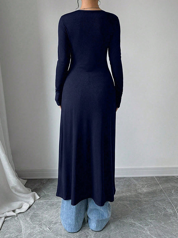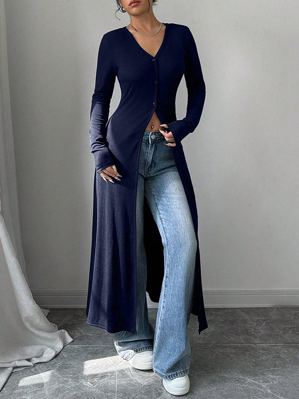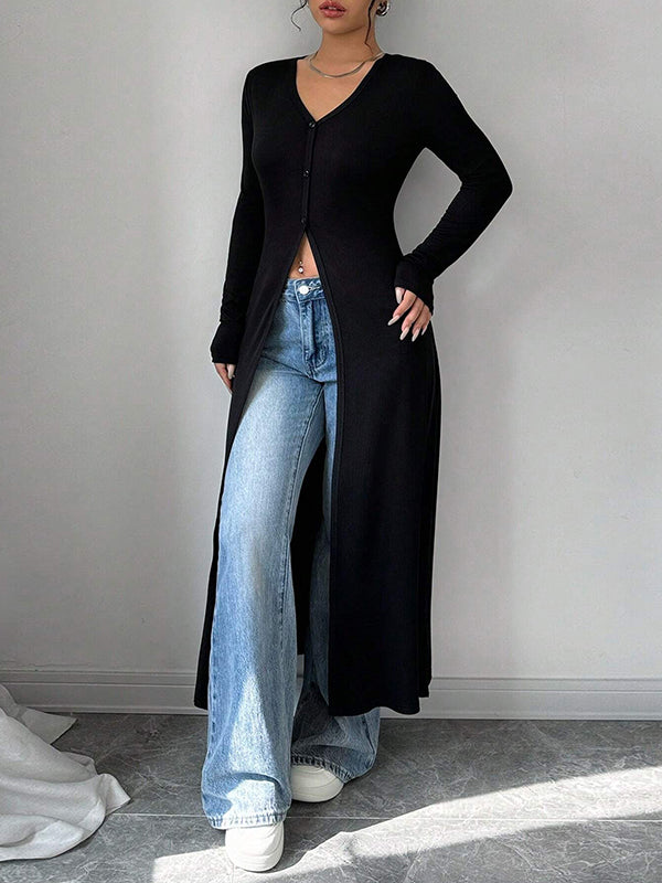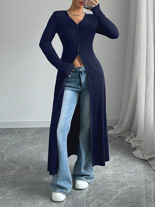 Long Sleeves Skinny Buttoned Solid Color Split-Front V-Neck T-Shirts