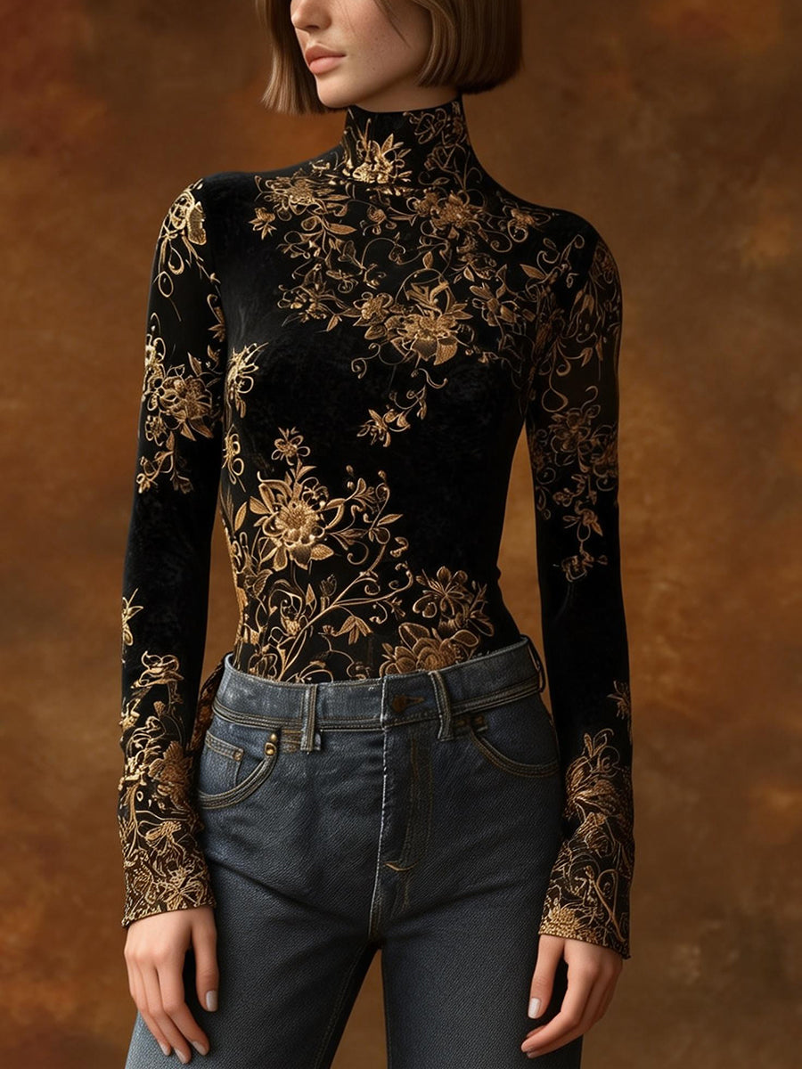 Long Sleeves Skinny Contrast Color Flower Print Split-Joint High Neck Blouses&Shirts Tops