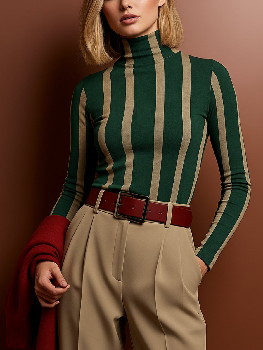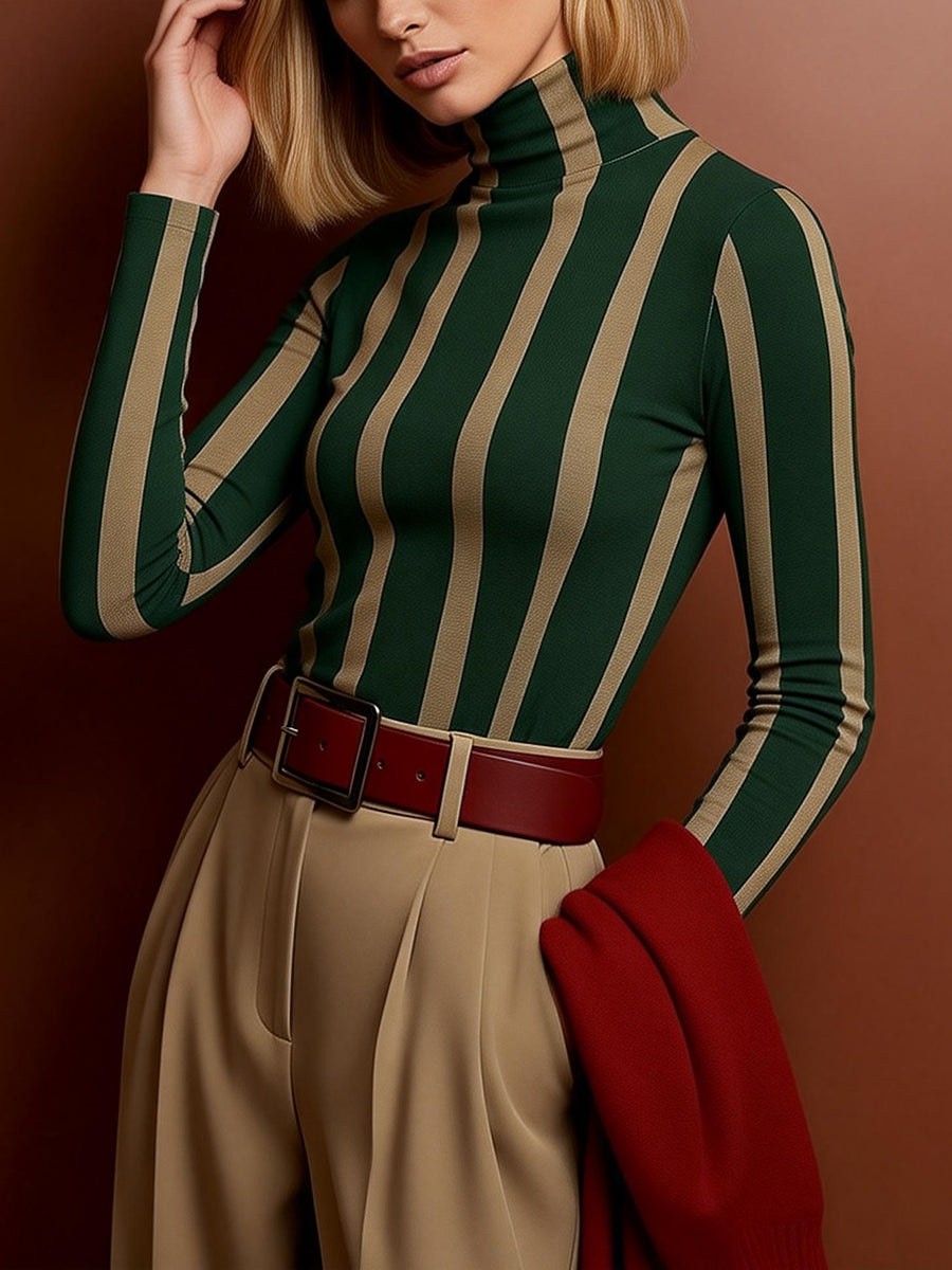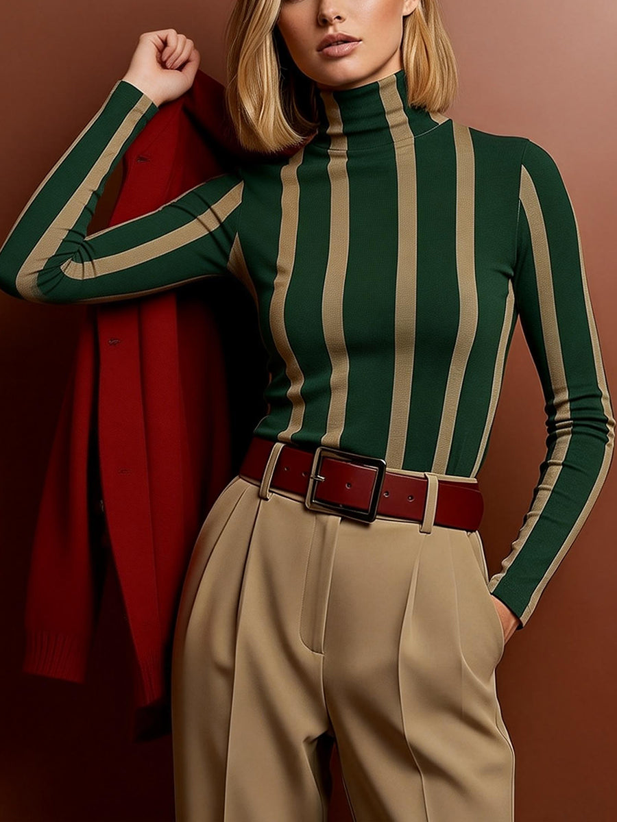 Long Sleeves Skinny Contrast Color Split-Joint Striped High Neck Blouses&Shirts Tops