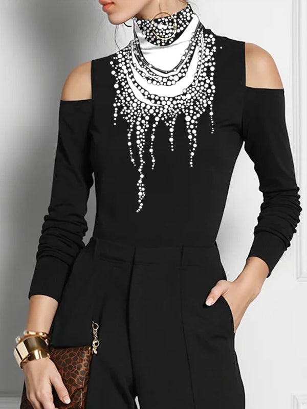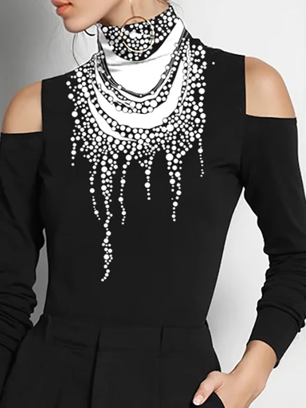 Long Sleeves Skinny Hollow Printed Cold Shoulder T-Shirts Tops