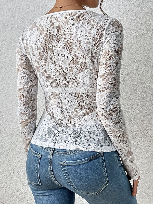 Long Sleeves Skinny Lacy See-Through Solid Color V-Neck T-Shirts