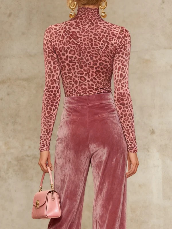 Long Sleeves Skinny Leopard High Neck T-Shirts Tops