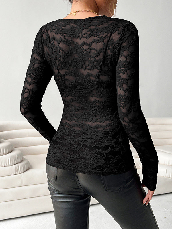Long Sleeves Skinny See-Through Solid Color Deep V-Neck T-Shirts