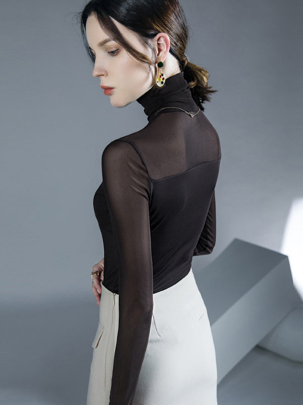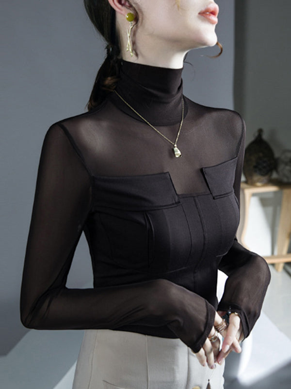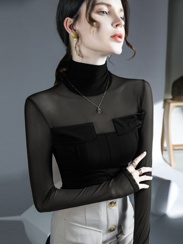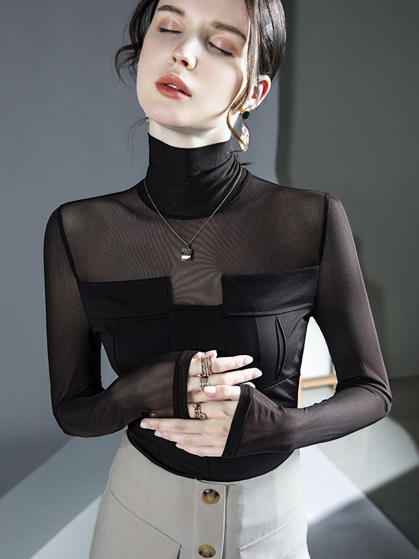Long Sleeves Skinny See-Through Solid Color Split-Joint High Neck Blouses&Shirts Tops