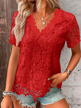 Loose Plus Size Embroidered Hollow Solid Color Split-Joint V-Neck T-Shirts Tops
