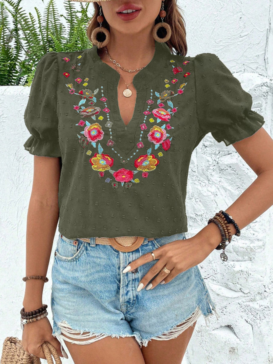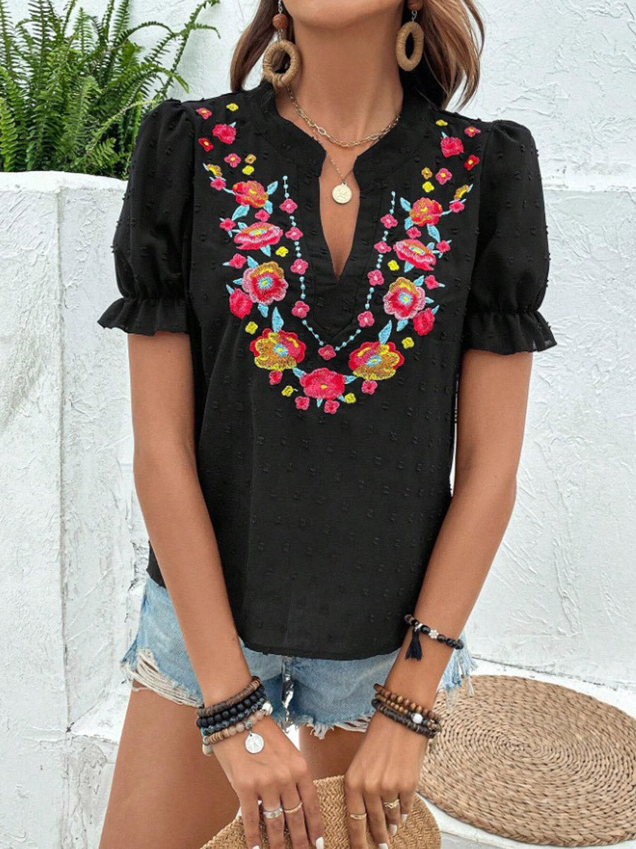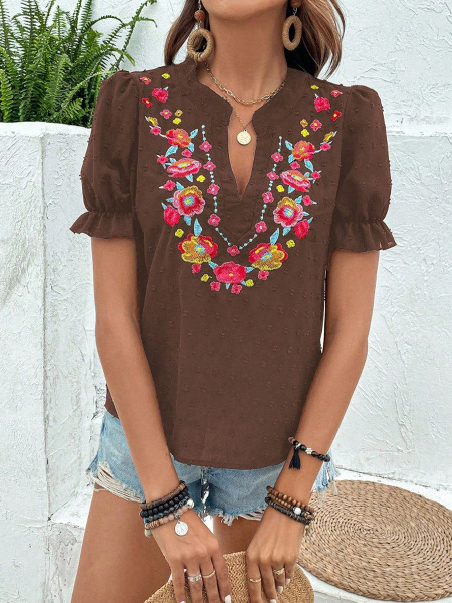 Loose Puff Sleeves Flower-Embellished Contrast Color Jacquard Pleated Ruffled Split-Joint V-Neck Blouses&Shirts Tops