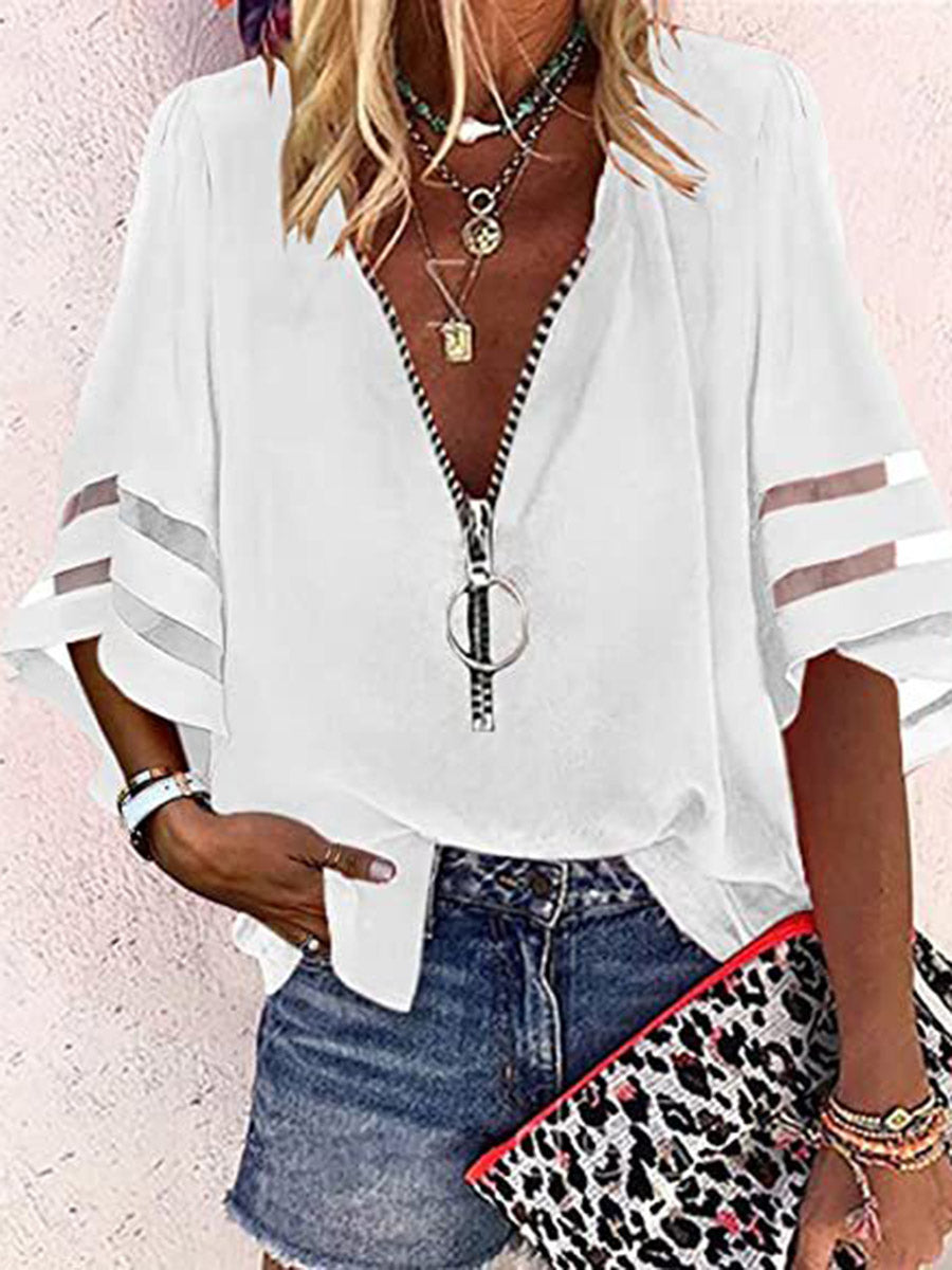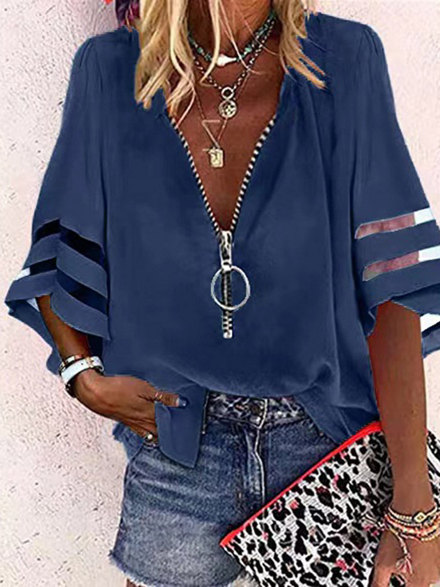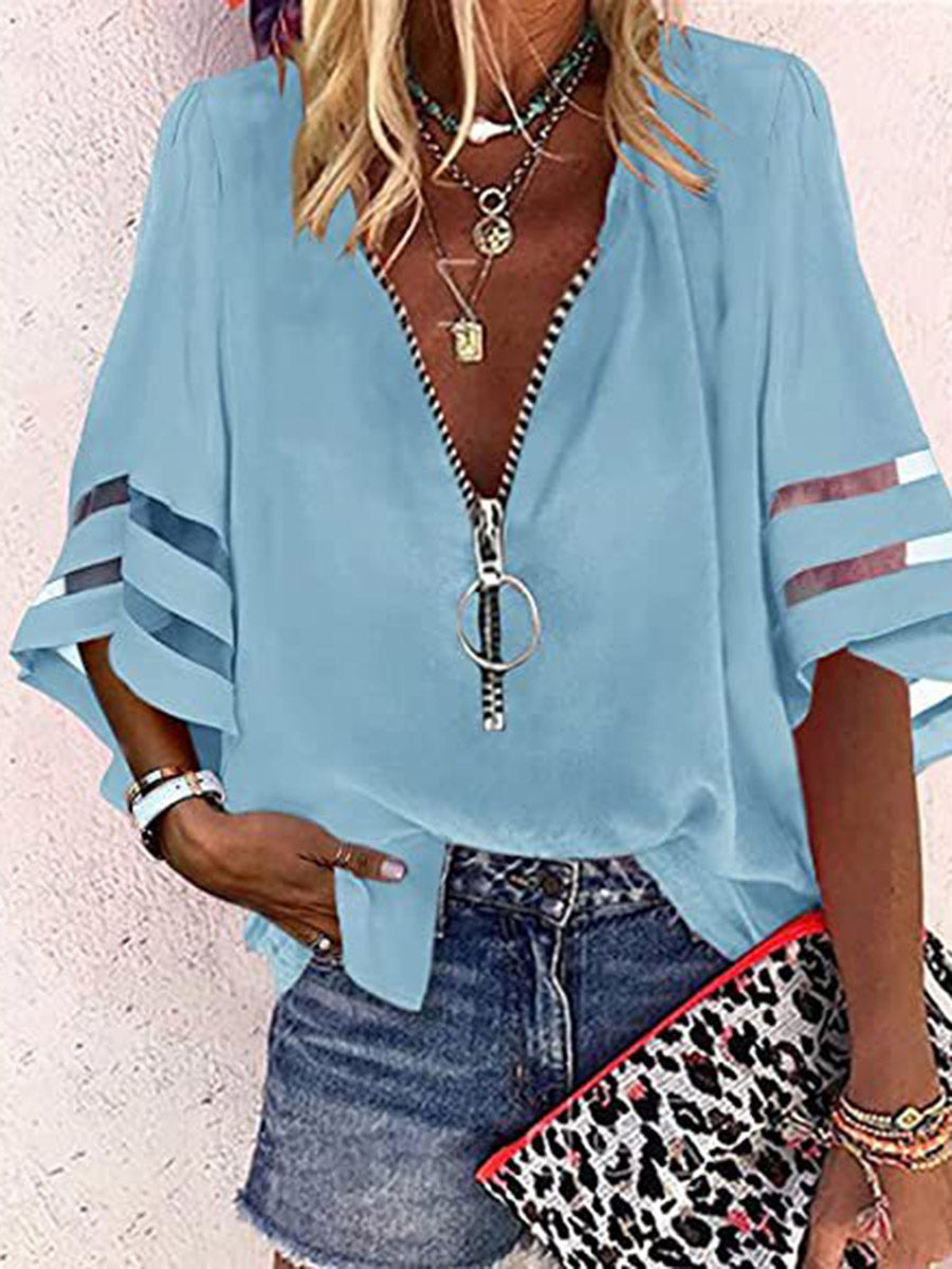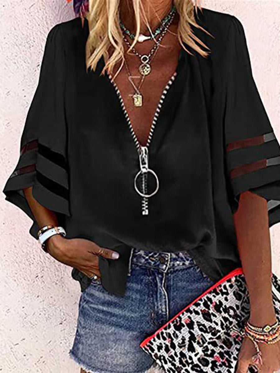 Loose Seven-Quarter Sleeves Hollow Solid Color Split-Joint Zipper Stand Collar Blouses&Shirts Tops