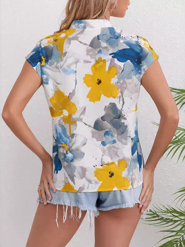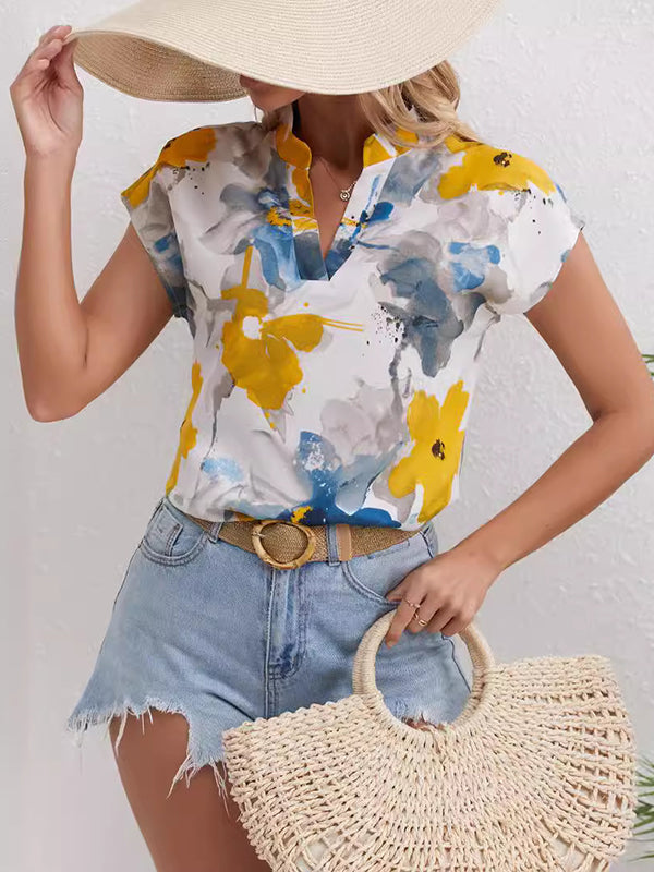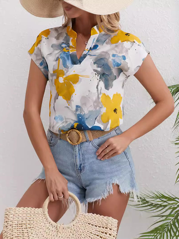 Loose Short Sleeves Comfort Contrast Color Flower Print V-Neck Blouses&Shirts Tops