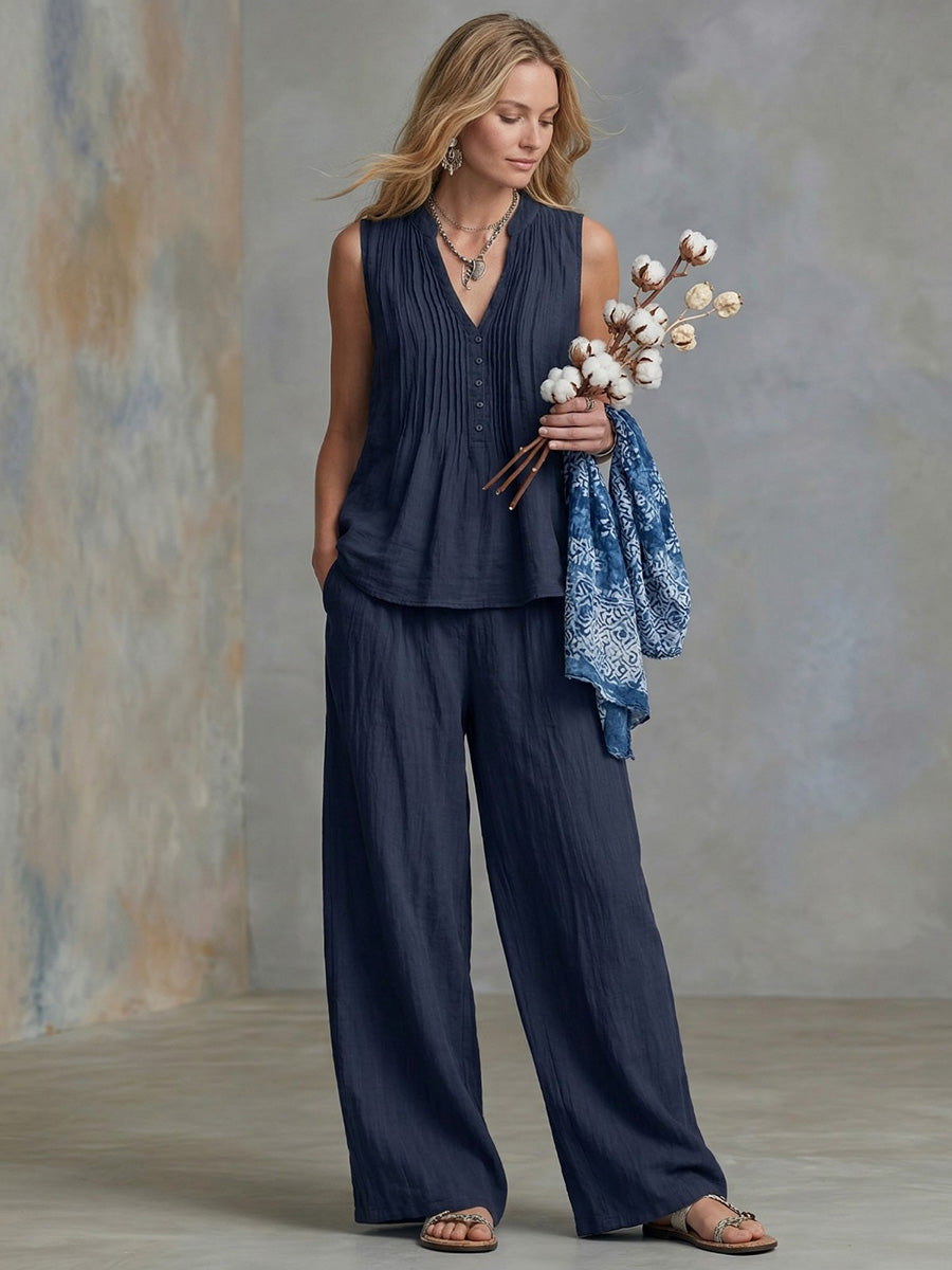 Loose Sleeveless Buttoned Pleated Solid Color V-Neck Blouses&Shirts Tops