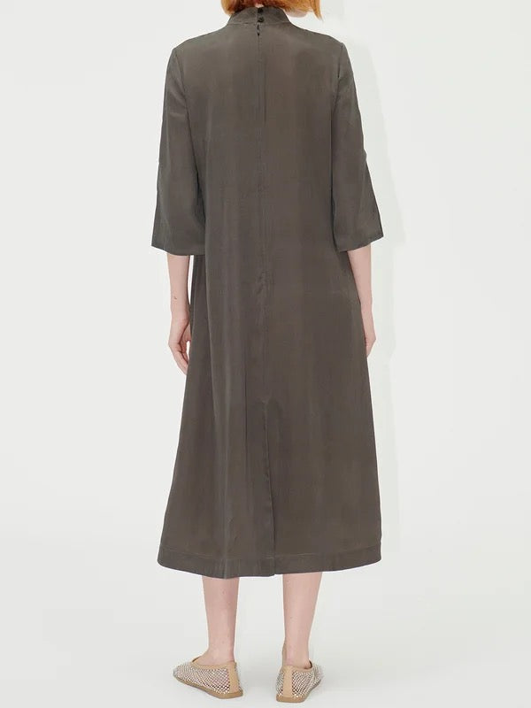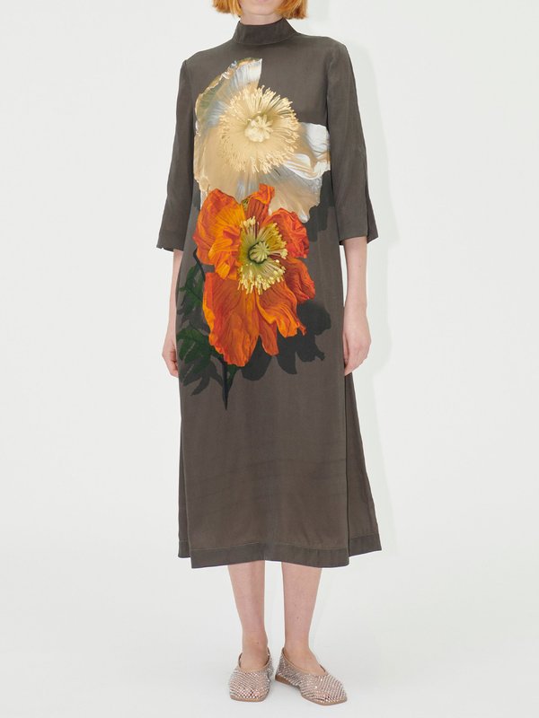 Loose Three-Quarter Sleeves Flower Print Mock Neck Midi Dresses