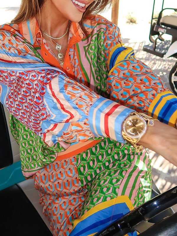 Multi-Color Patchwork Long-Sleeved Lapel Shirt Top + Baggy Pants Pocket Casual Pants Two-Piece Set