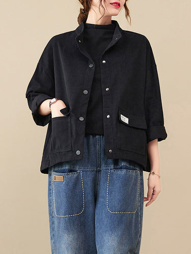 Vintage Long Sleeves Loose Buttoned Solid Color High-Neck Outerwear