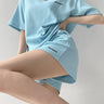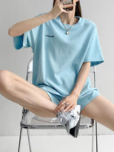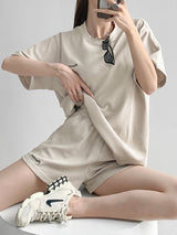 Mangas curtas T-shirt de gola redonda de junta dividida + curta de cintura de elasticidade Duas peças Conjunto