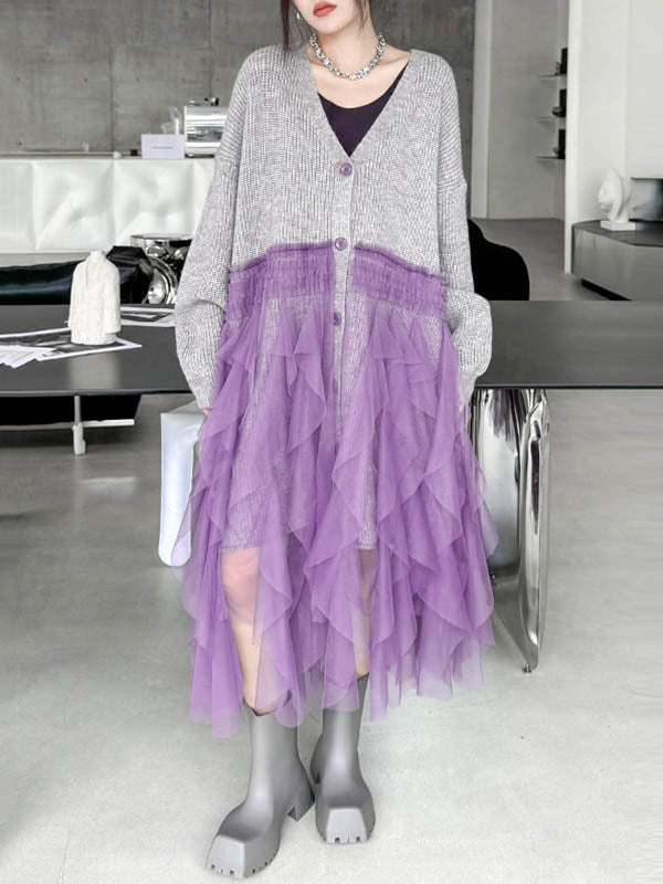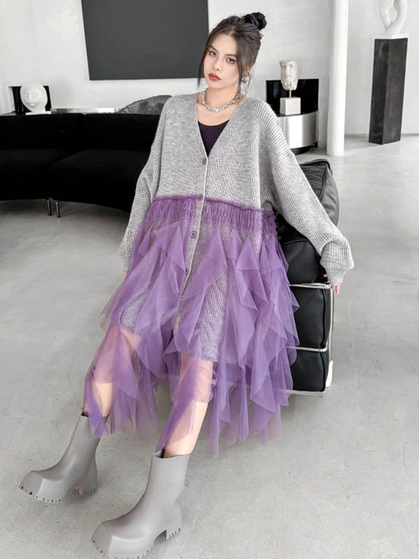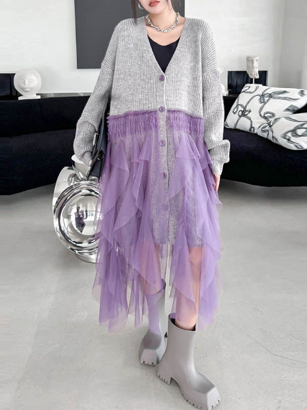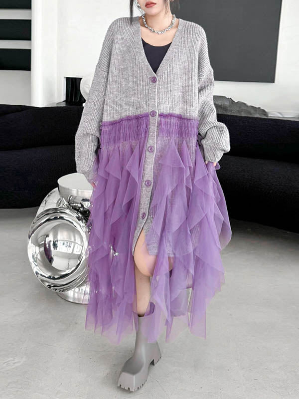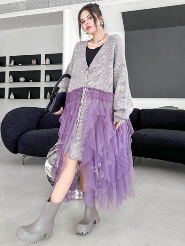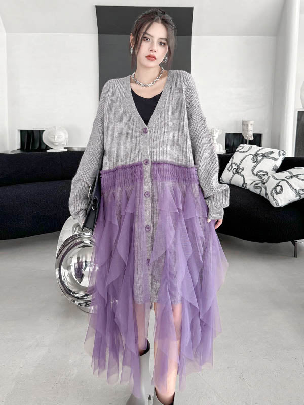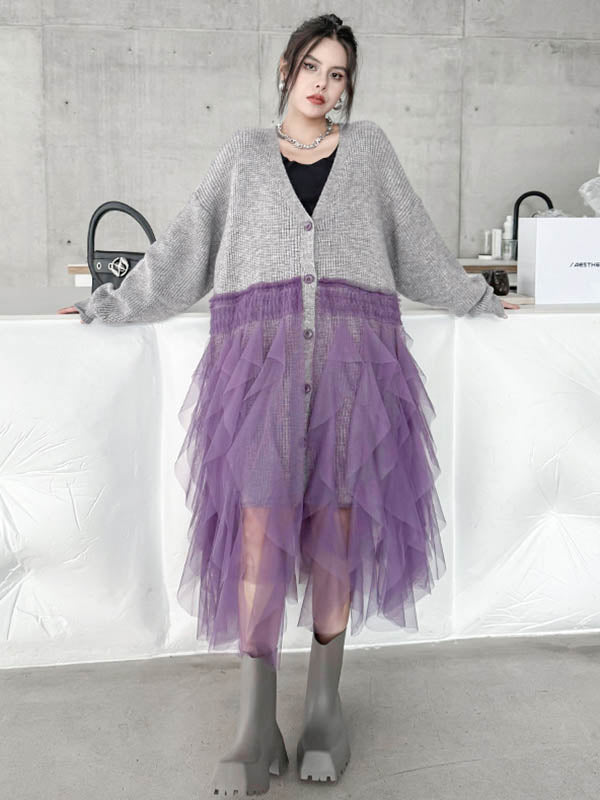 High-Low Irregularity Buttoned Contrast Color Mesh Pleated Ribs Split-Joint Collarless Cardigan Tops Outerwear