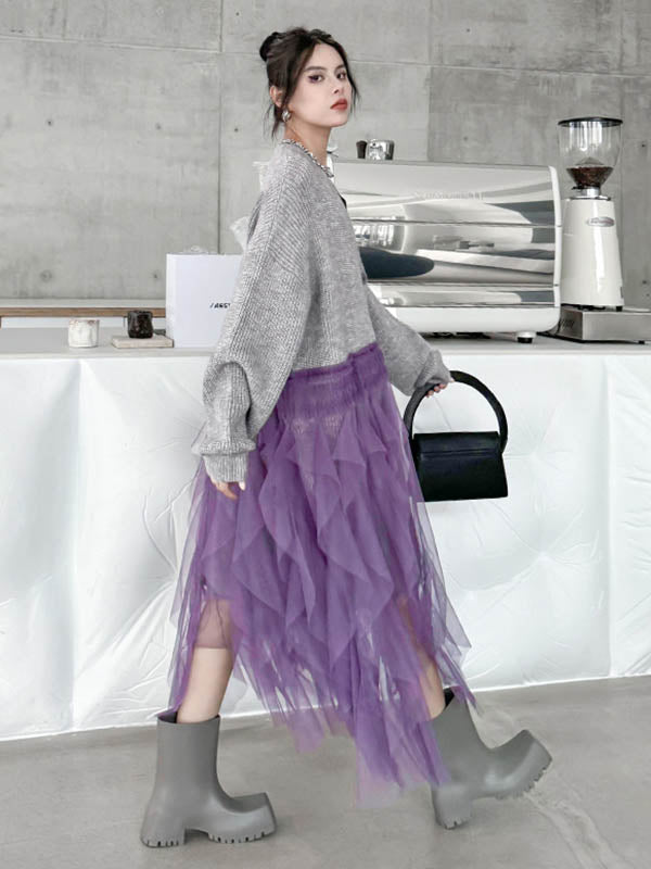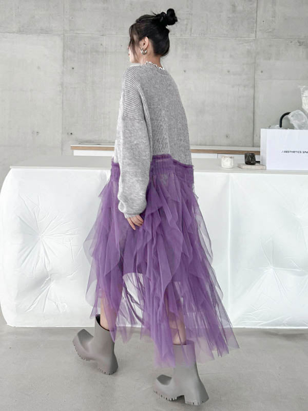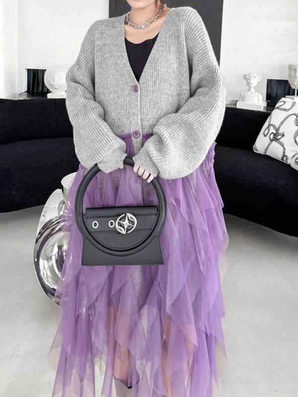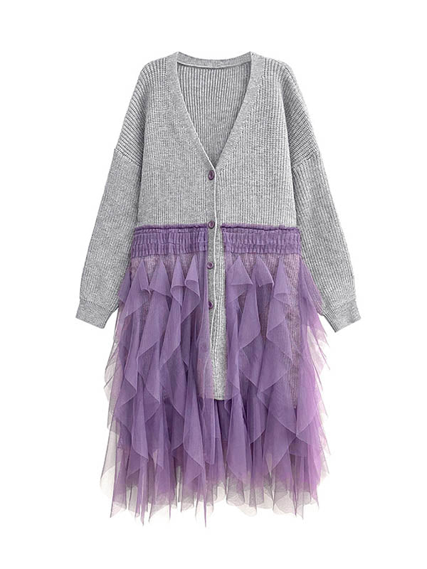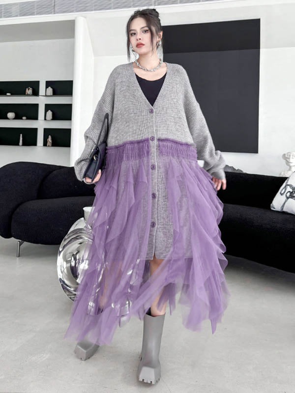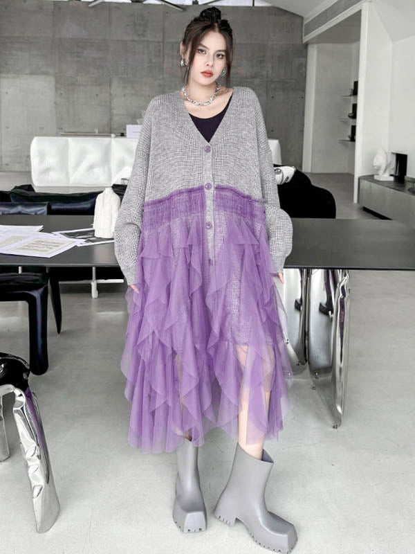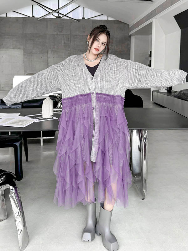 High-Low Irregularity Buttoned Contrast Color Mesh Pleated Ribs Split-Joint Collarless Cardigan Tops Outerwear