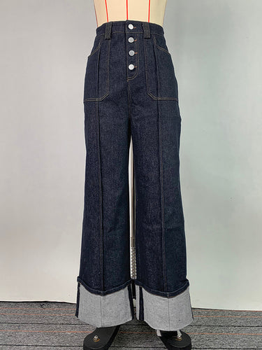 Alta cintura reta perna contraste a cor de junta dividida Jean calças de fundo