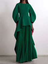 Mangas compridas soltas plissadas plissadas de cor sólida de junta dividida Vestidos maxi de pescoço redondo em camadas
