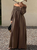 Loose Puff Sleeves Elasticity Pleated Solid Color Off-The-Shoulder Maxi Dresses