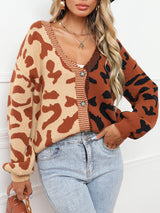 Mangas compridas Longo de leopardo abotoado Tops de cardigã de decote em V Split-decote em V