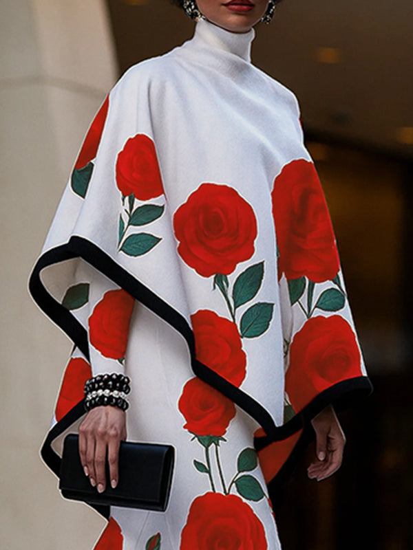 Long Sleeves Loose Flower Print High Neck 1 Piece Cape