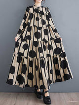 Mangas longas A-line abotoado placas de polka-pontinha colarira maxi vestido de vestido de colarinho