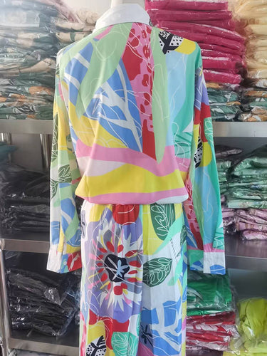 Contraste a cores Impresso de mangas compridas Blowoted Lapeel Bloups Top+ calça alta de cintura alta Duas peças conjuntos