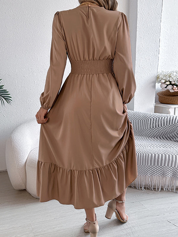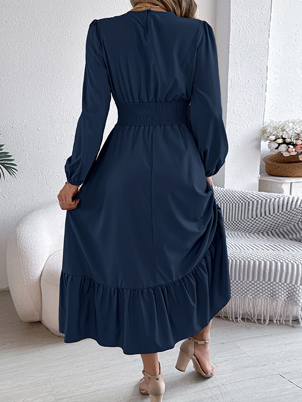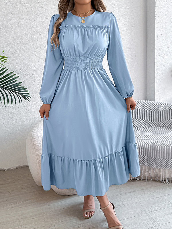 A-Line Elasticated Waist Pleated Solid Color Round-Neck Maxi Dresses