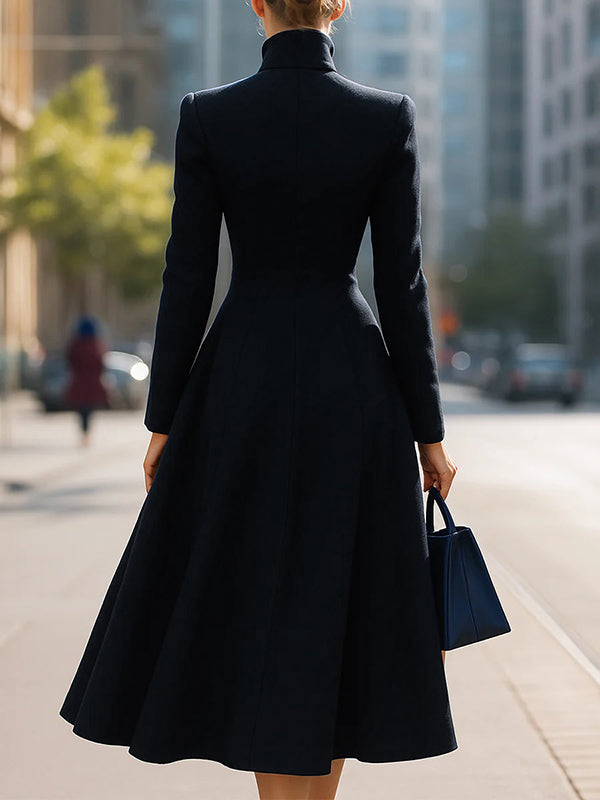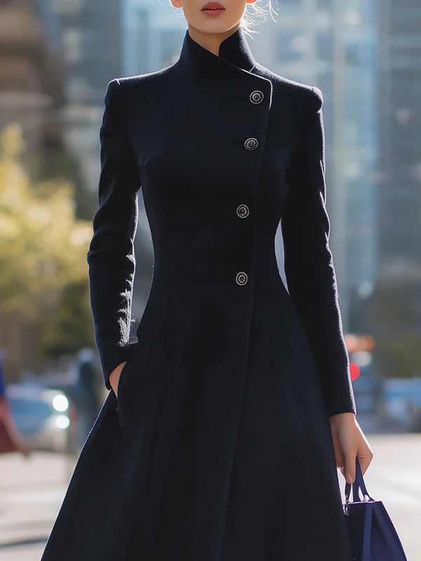 A-Line Long Sleeves Buttoned Pockets Solid Color Stand Collar Woolen Coat