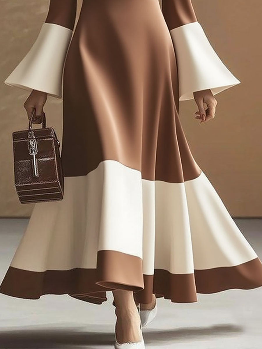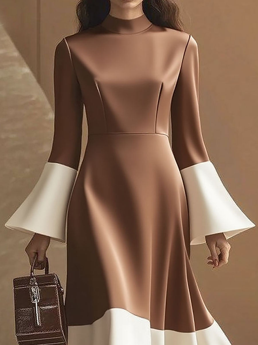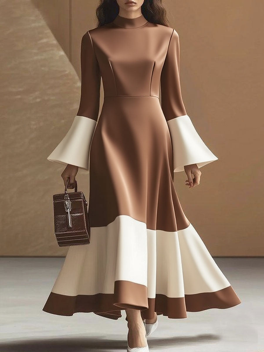 Flared Sleeves High Waisted Contrast Color Pleated Split-Joint Mock Neck Maxi Dresses