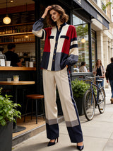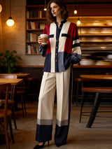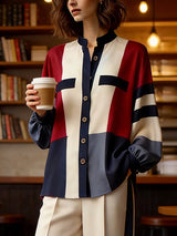 Long Sleeves Loose Buttoned Contrast Color Split-Joint Stand Collar Blouses&Shirts Tops