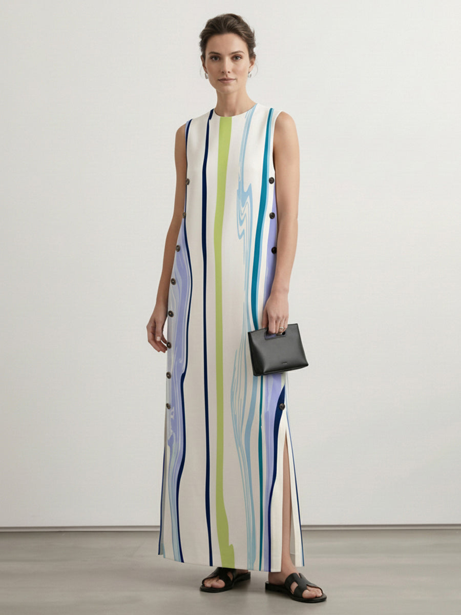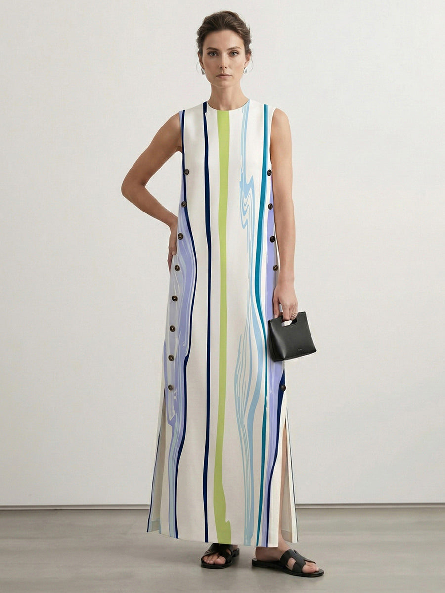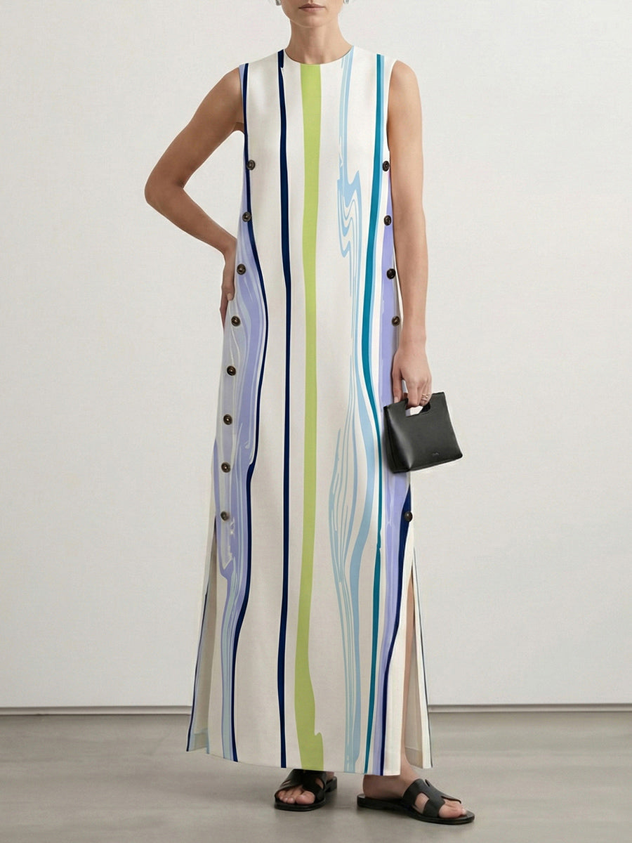 Loose Sleeveless Buttoned Contrast Color Print Split-Joint Split-Side Striped Round-Neck Maxi Dresses