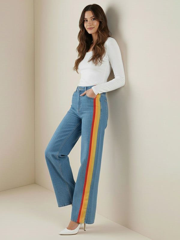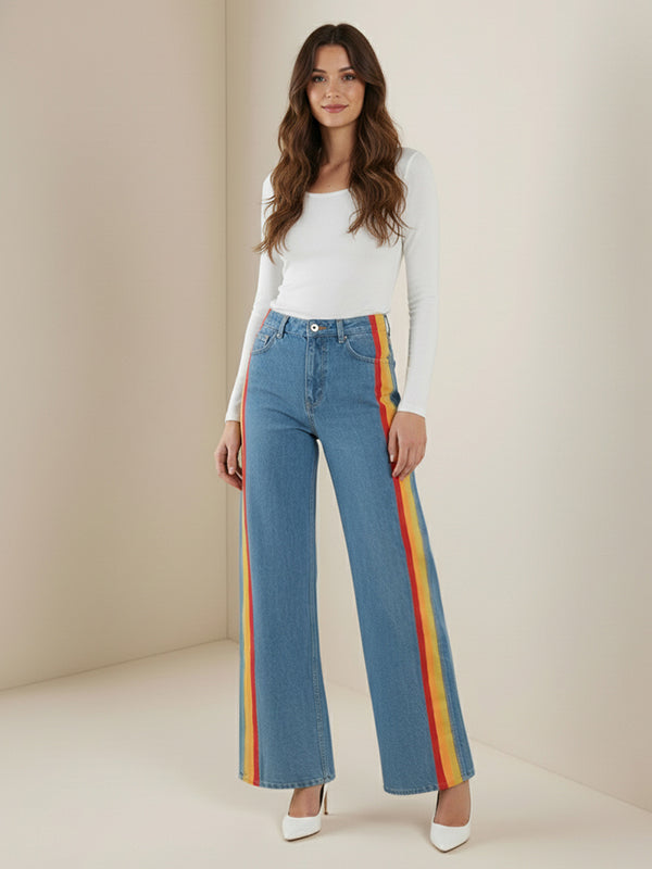 Wide Leg Contrast Color Plain Pockets Jean Pants Bottoms