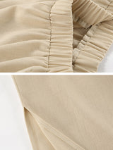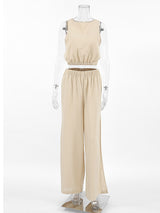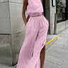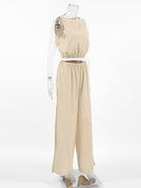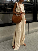 Gevşek esneklik düz renkli bölünmüş eklem yuvarlak boyun yelek + yüksek bel bölünmüş taraf pantolon iki parça seti