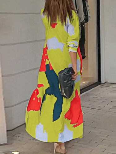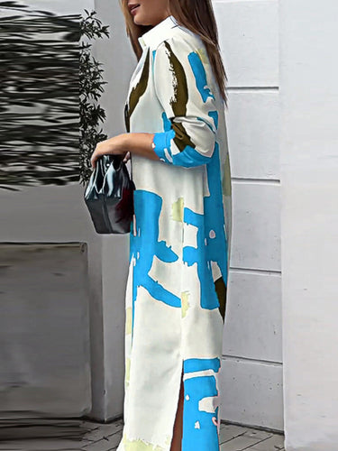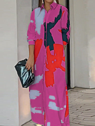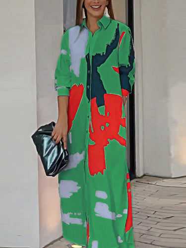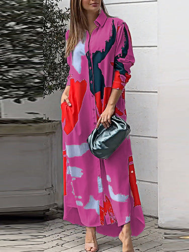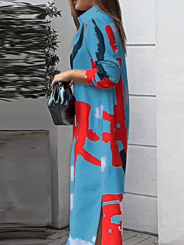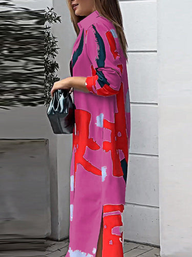 Gevşek sarılı düğmeli kontrastlı renkli cepler baskılı bölünmüş gömlek elbisesi