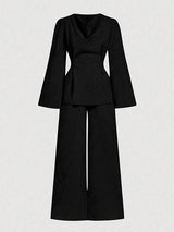 Long Sleeves Solid Color Split-Joint Tied Waist V-Neck Blouses&Shirts Tops