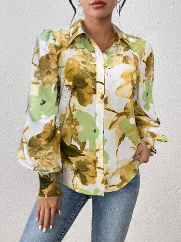 Uzun kollu gevşek düğmeli esneklik çiçek baskı pileli yaka bluz gömlekler üstleri