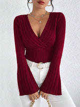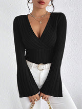 Alevlenmiş kollu uzun kollu düz renk bölünmüş eklem derin v yaka tişörtler