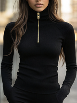 Long Sleeves Skinny Solid Color Zipper High Neck Pullovers