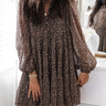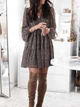Uzun Kollu Gevşek Düğmeli Leopar Pileli V Yastık Mini Elbiseler