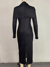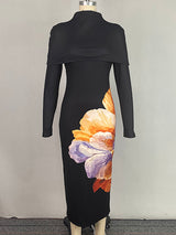 Bodycon capelet çiçek baskısı sahte boyunlu elbiseler