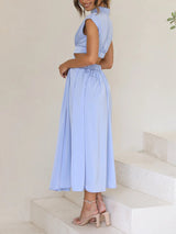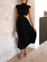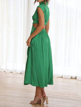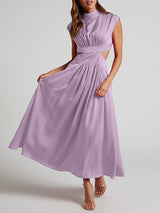 Kapak kolu göbek taklit etli düz renk standı yakalı maksi elbiseler