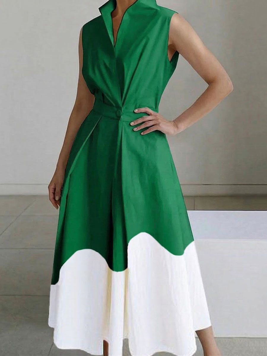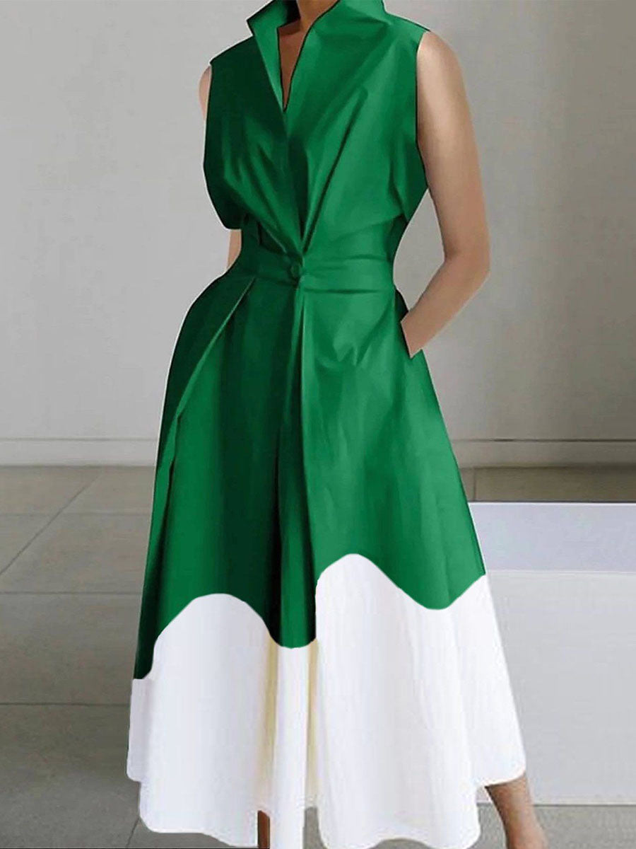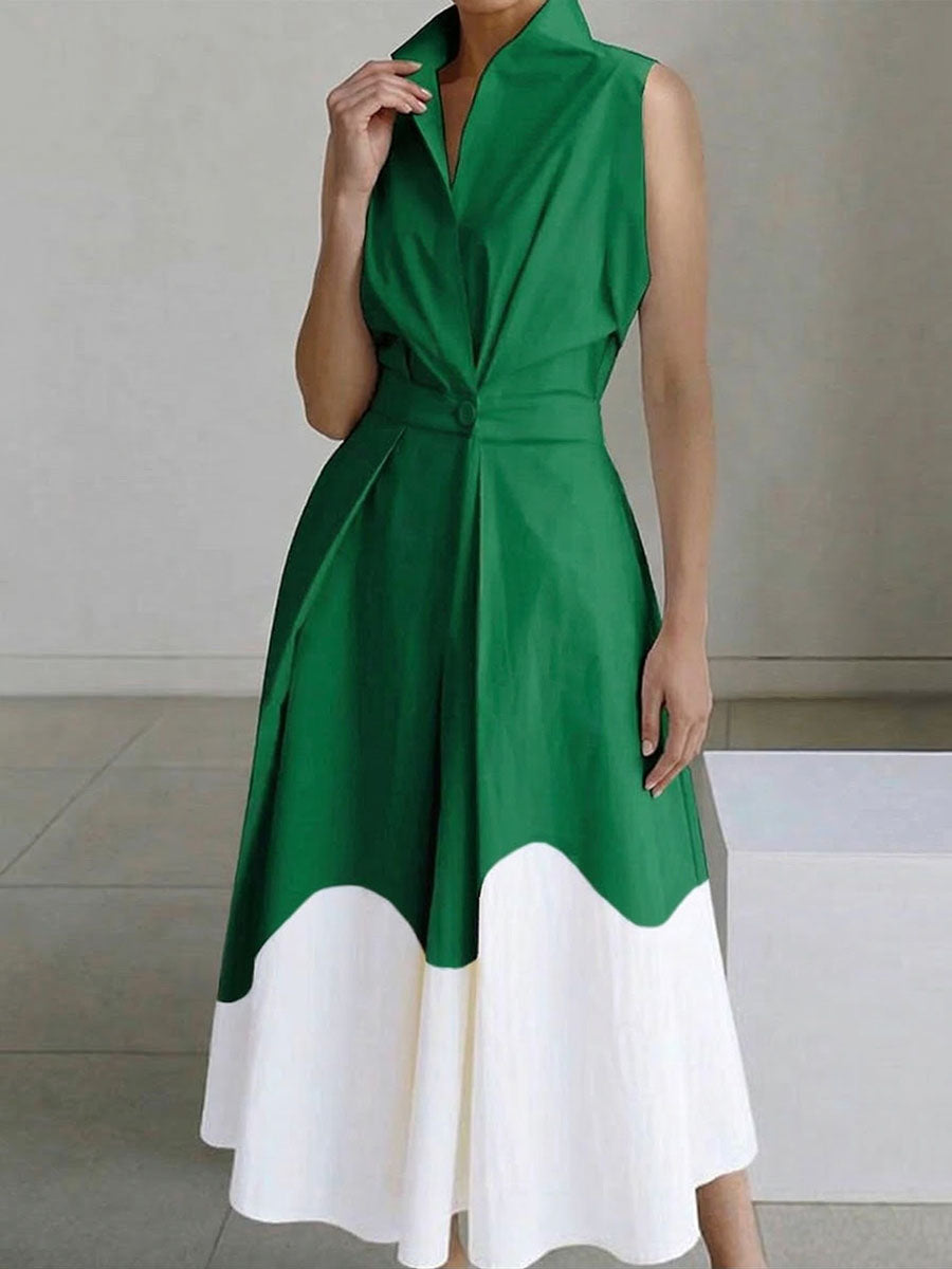 A-Line High Waisted Buttoned Contrast Color Pleated Pockets Split-Joint Lapel Midi Dresses