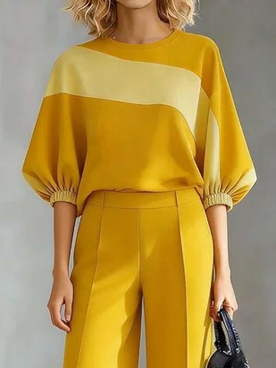 Batwing Sleeves Loose Contrast Color Pleated Split-Joint Round-Neck Blouses&Shirts Tops