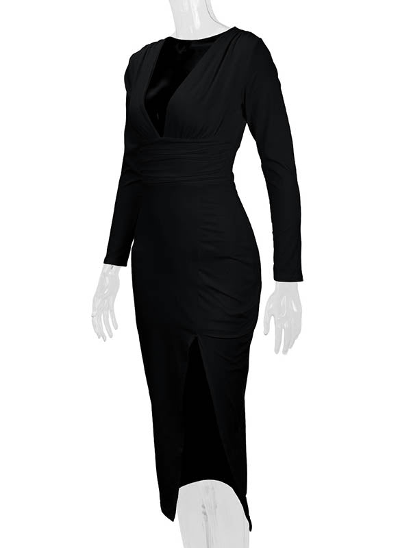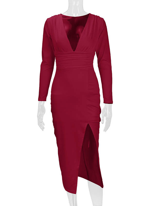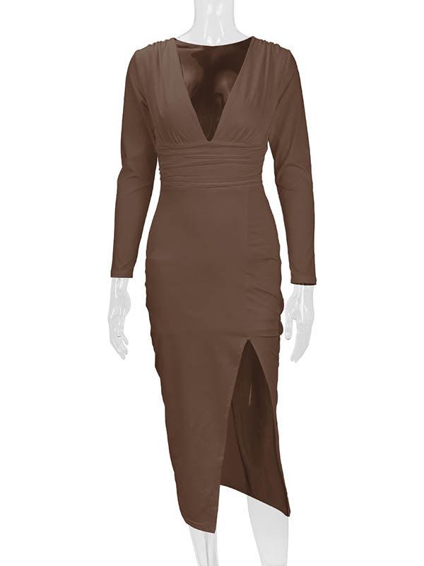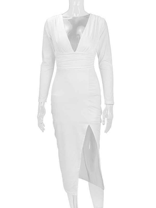 Bodycon Elasticated Waist Pleated Solid Color Split-Joint Split-Side Deep V-Neck Midi Dresses