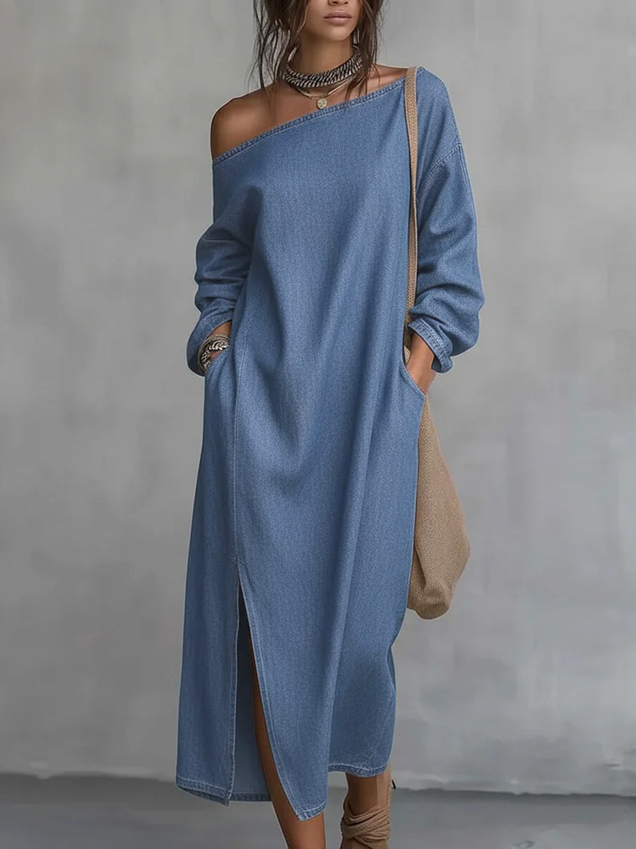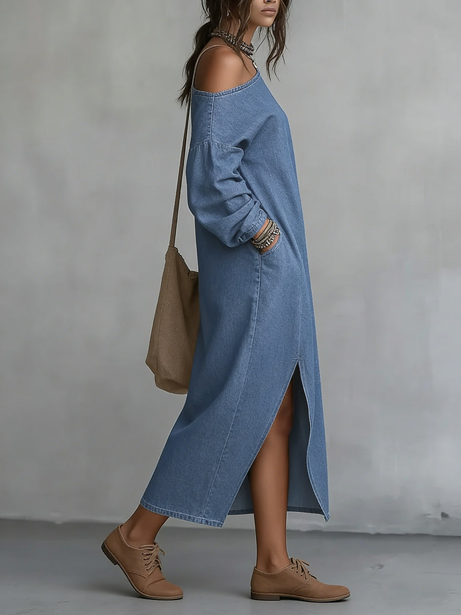 H-line Long Sleeves Pockets Solid Color Split-front One-shoulder Maxi Dresses