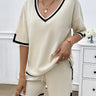 Yarım kollu gevşek kontrast renk v yaka tişört üst + şort alt kazak iki parça seti
