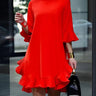 Yarım kollu gevşek falbala düz renkli yuvarlak boyunlu midi elbiseler