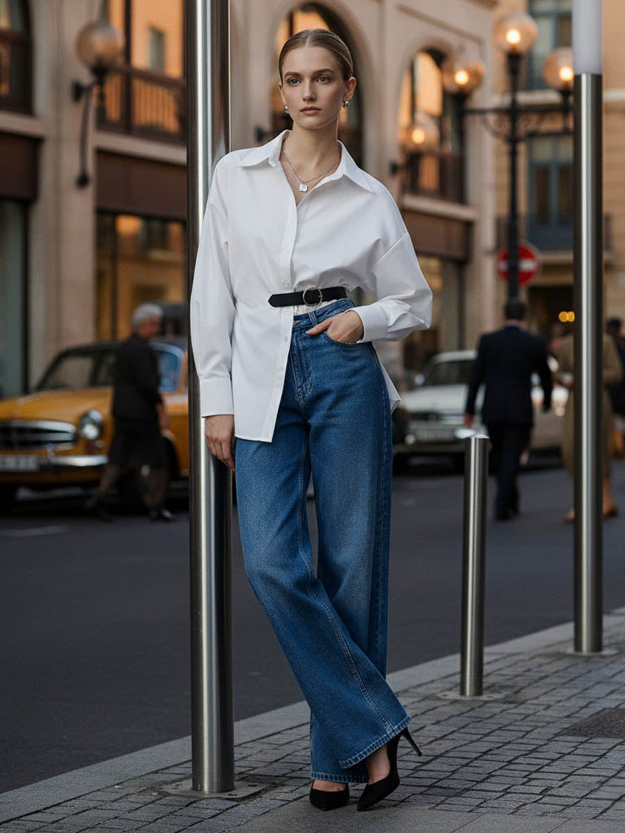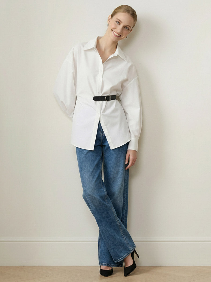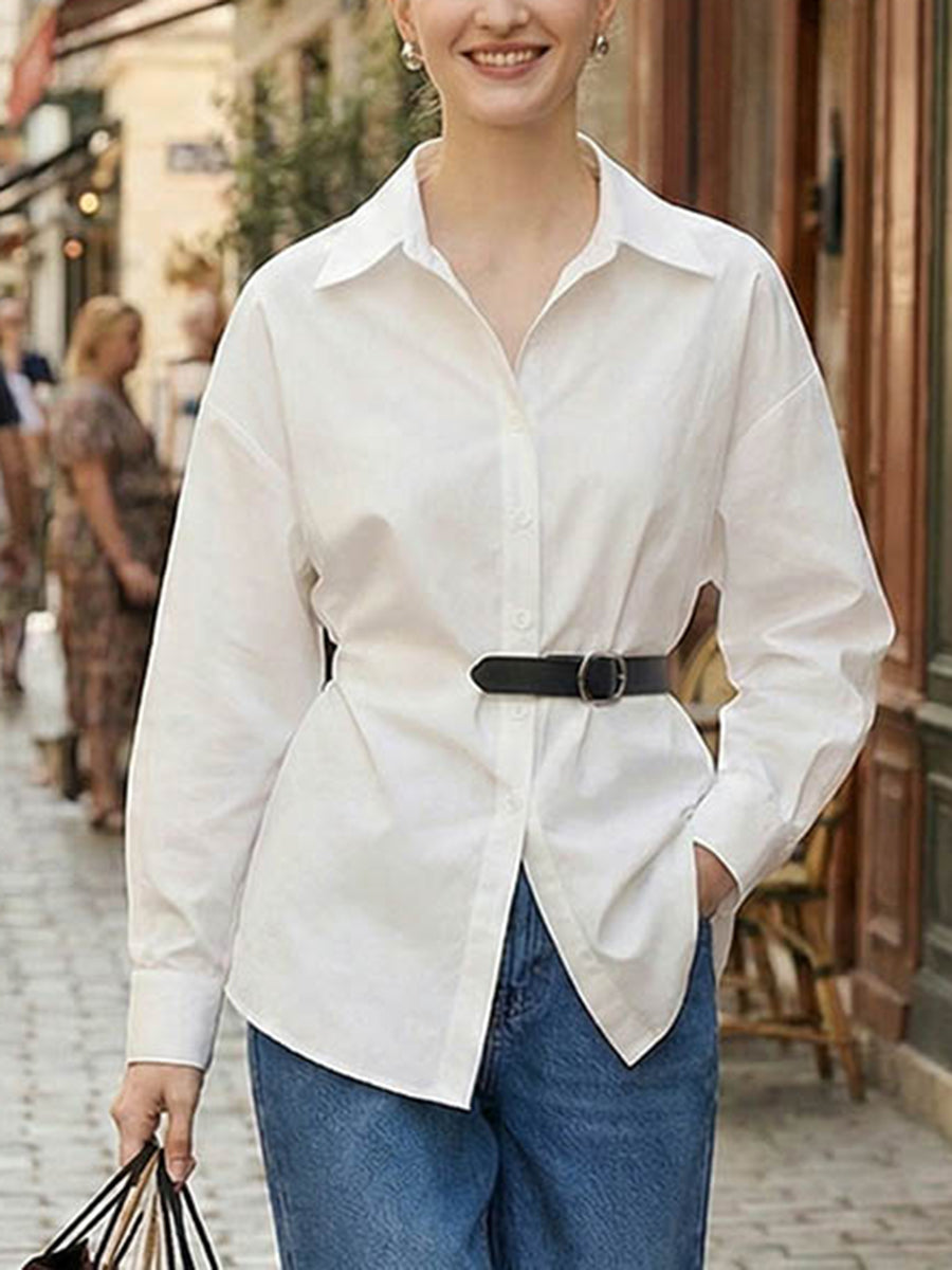Long Sleeves Loose Belted Buttoned Contrast Color Split-Joint Lapel Blouses&Shirts Tops