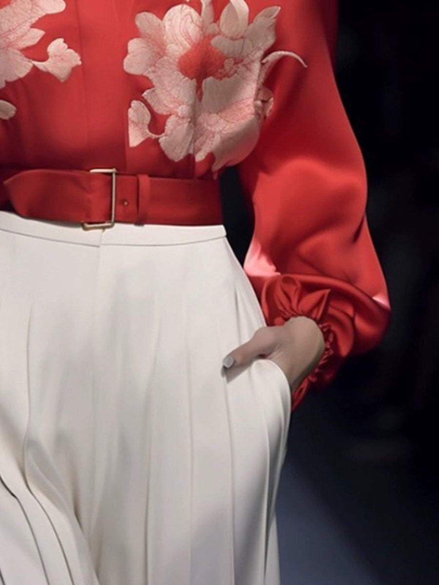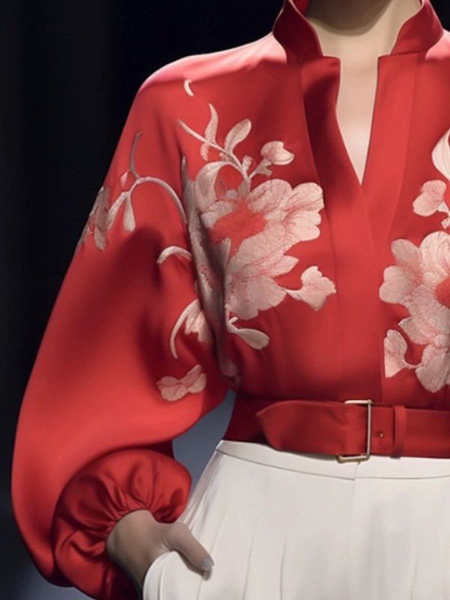 Long Sleeves Loose Buckle Elasticity Flower Print Stand Collar Blouses&Shirts Tops