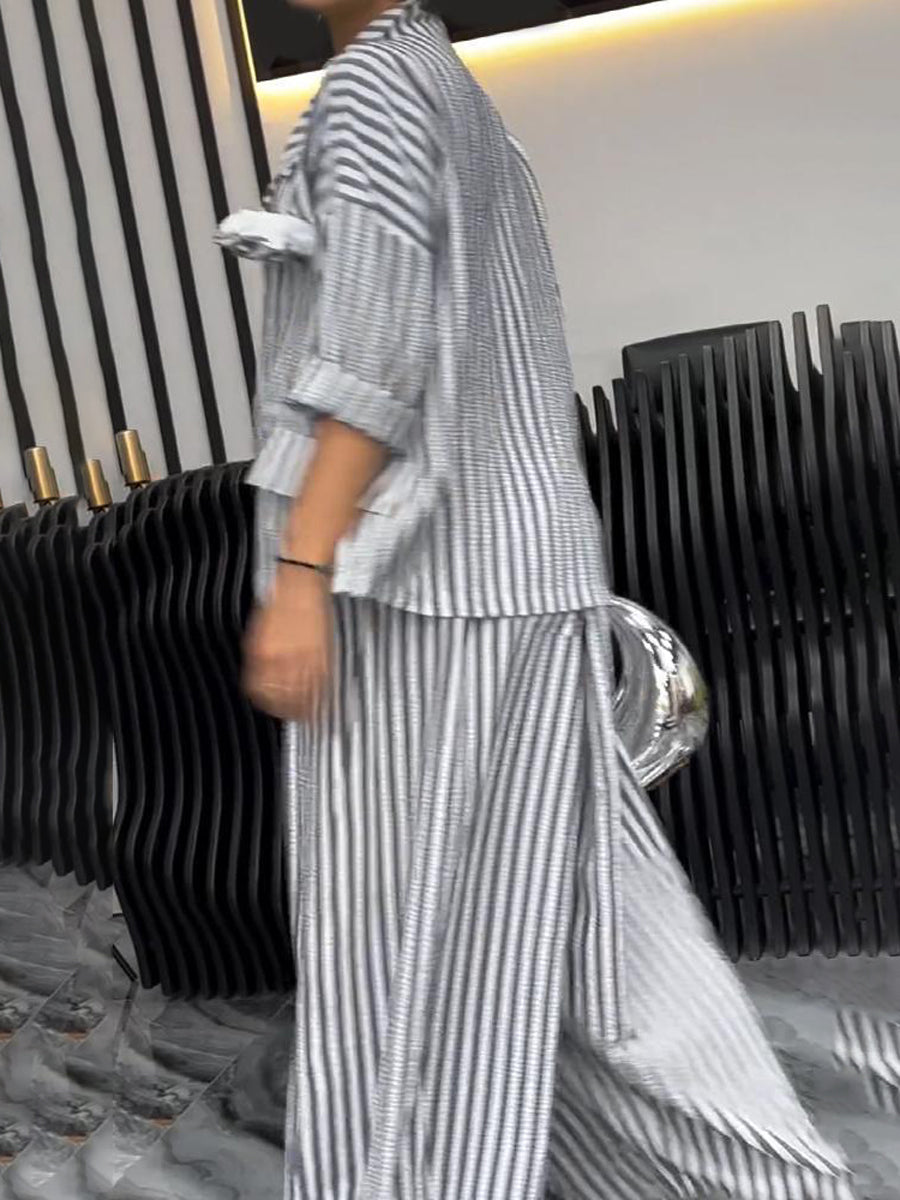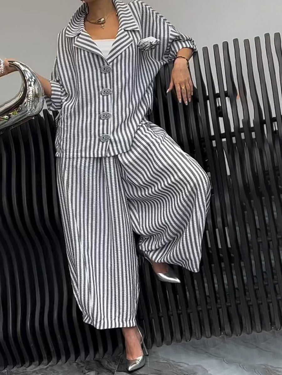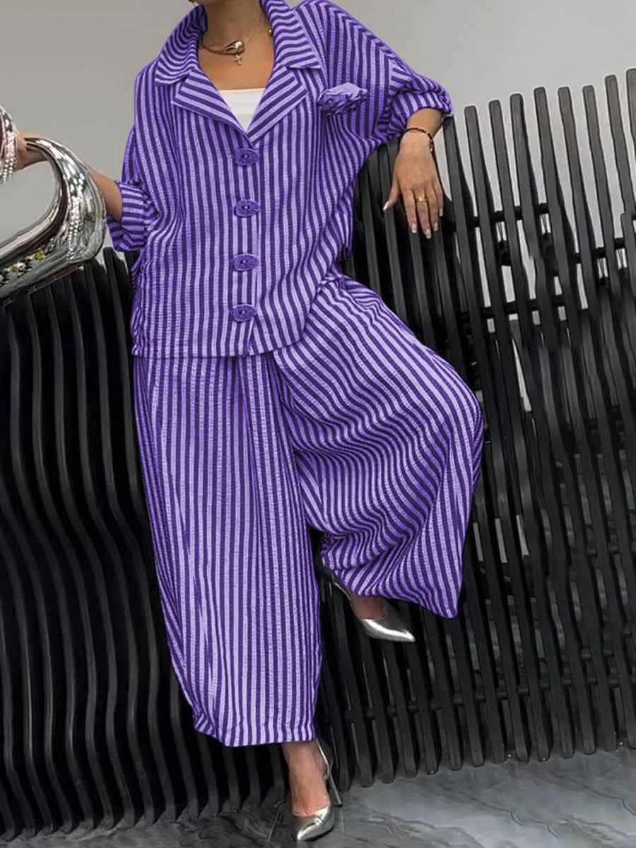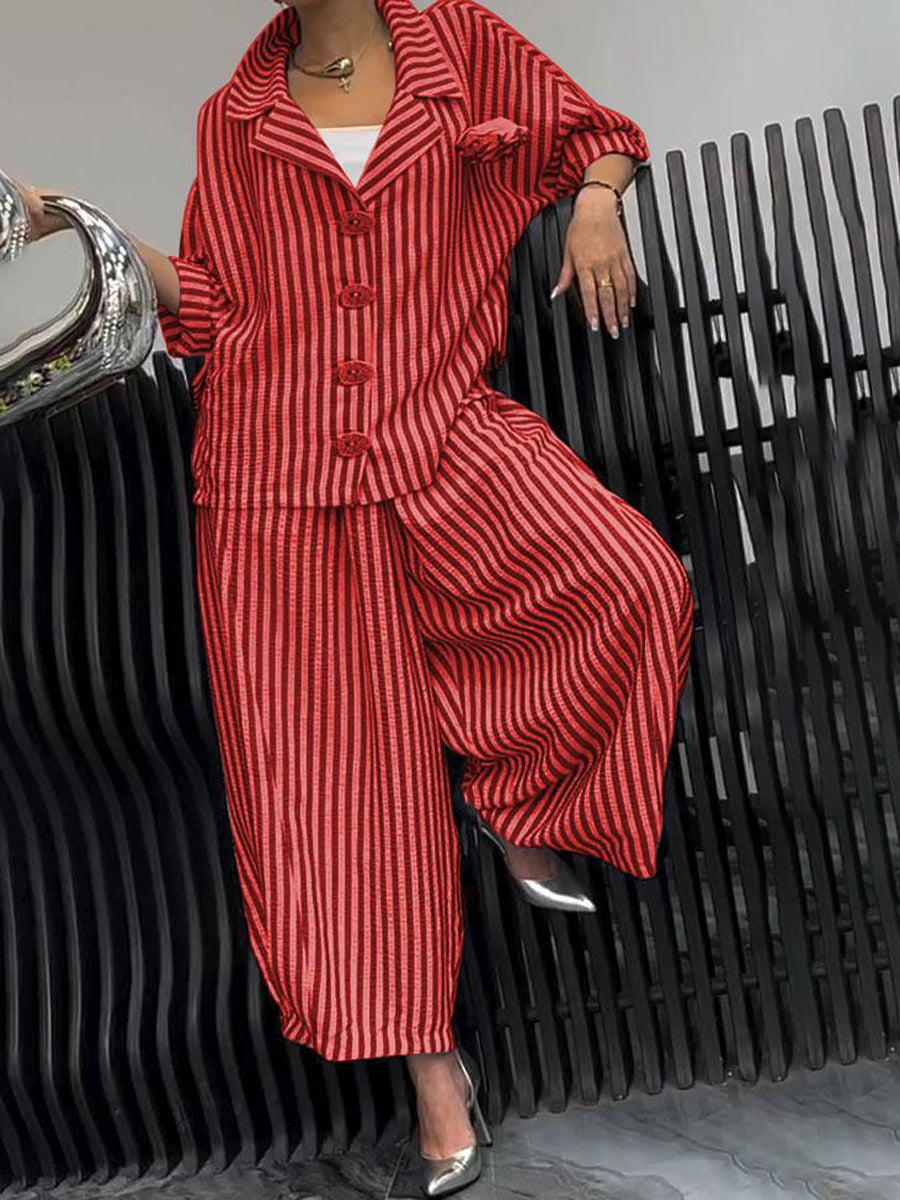 Long Sleeves Loose Buttoned Contrast Color Striped Notched Collar Two Pieces Set